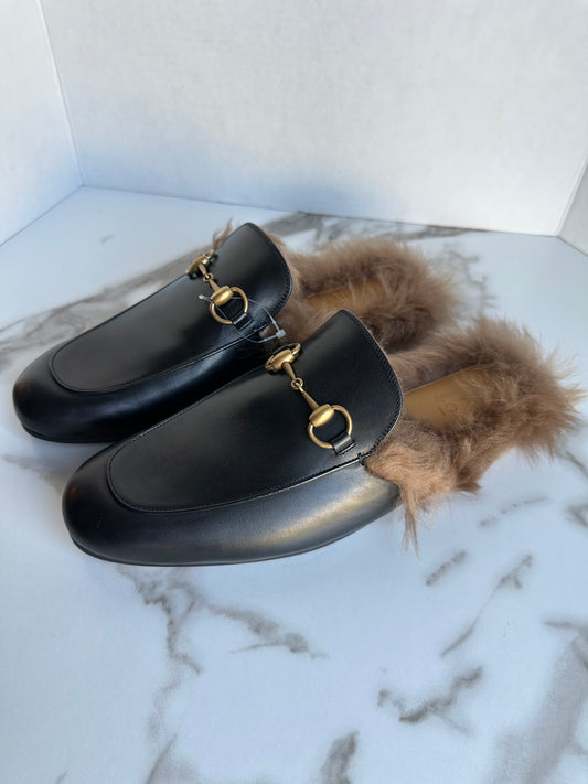Gucci Princetown Black Leather Fur Loafer Slide Slip On Mule Slipper Flat 9