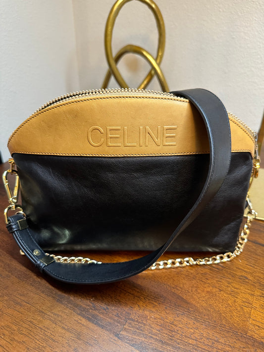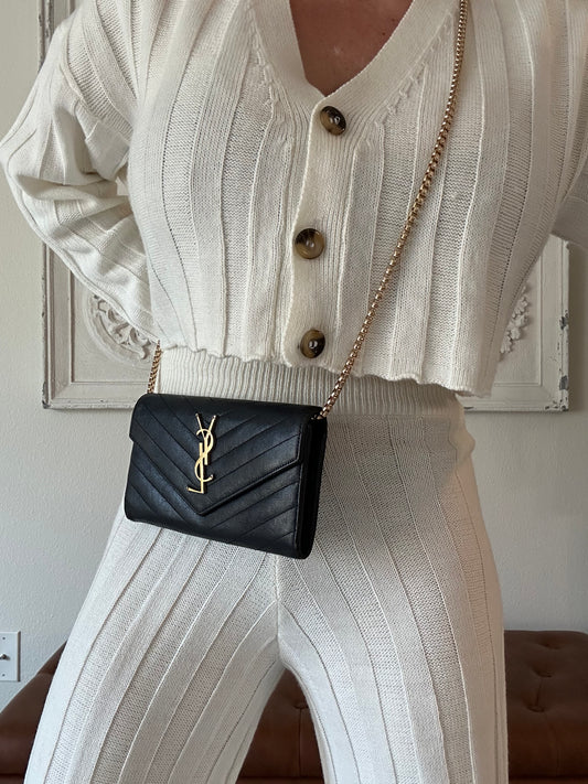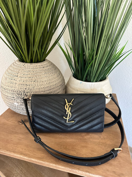 YSL Caviar Leather Flap Crossbody Purse Clutch WOC Black Gold