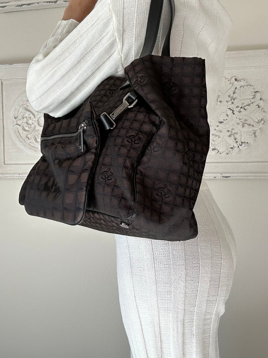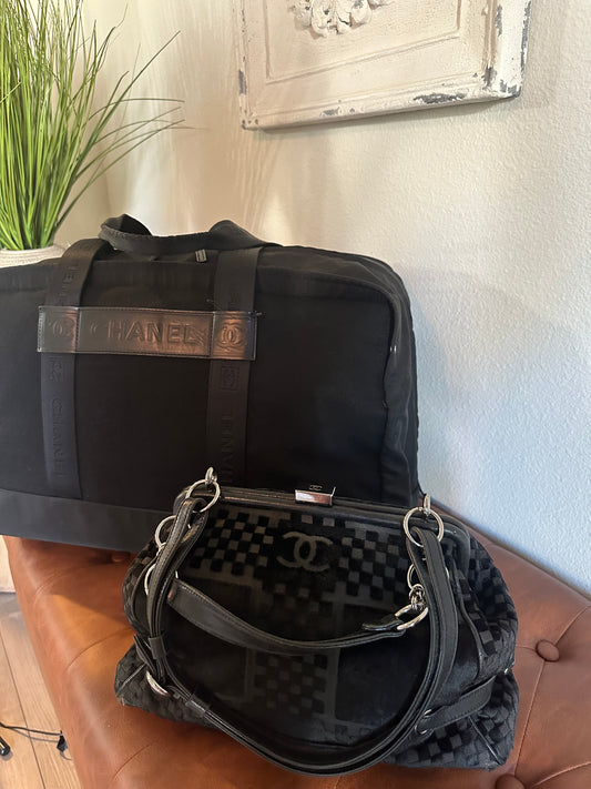 CHANEL Sports CC Logo Hand Bag Travel Canvas Wool Leather Black Silver LARGE